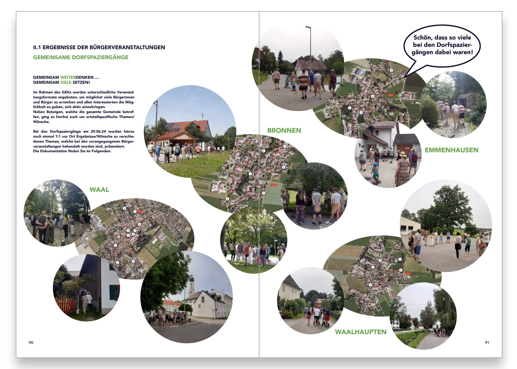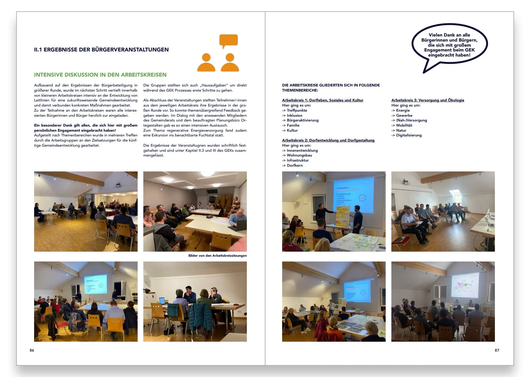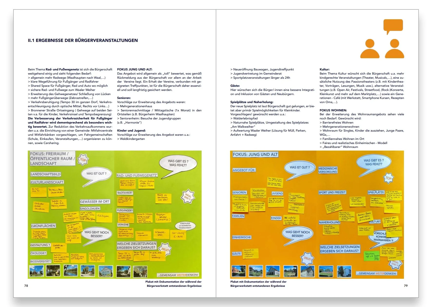 Der Abschlussbericht umfasst neben der fachplanerischen Analyse die Ergebnisse aus der Bürgerbeteiligung, sowie konkrete Handlungsempfehlungen und Maßnahmen für eine zukunftsweisende Gemeindeentwicklung. Die Übersicht zeigt Auszüge aus der Publikation.