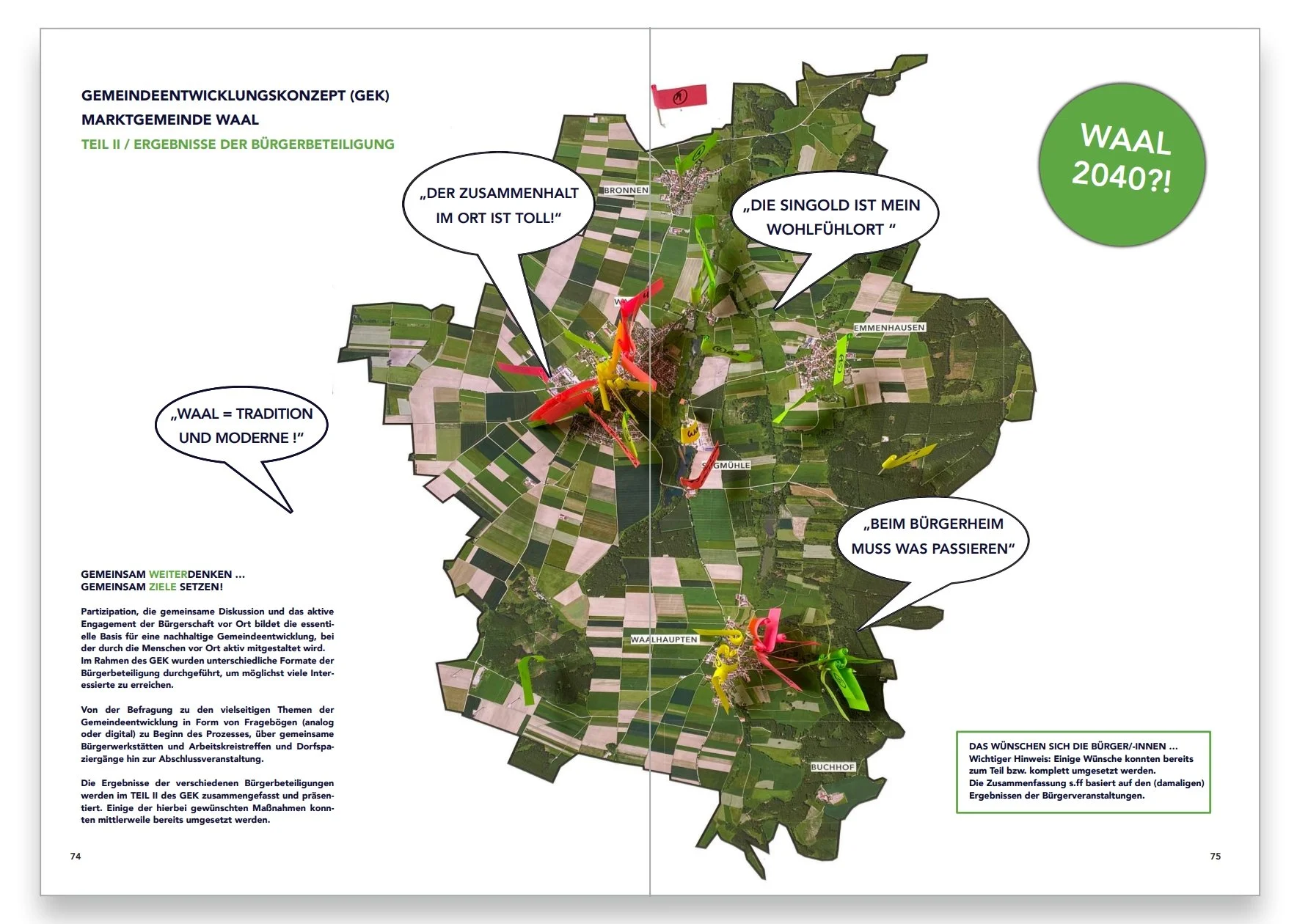 Bei dem Gemeindeentwicklungskonzept (GEK) für den Markt Waal ging es um die gemeinsame Erarbeitung von Leitlinien für die künftige Ortsentwicklung verbunden mit u.a. folgenden Zielsetzungen: Erhalt des qualitätsvollen Ortsbildes, Ausbau und Stärkung attraktiver Freiflächen und Treffpunkte für alle Generationen, Ausbau einer regenerativen Energieversorgung, sowie Reaktivierung von Leerstand.